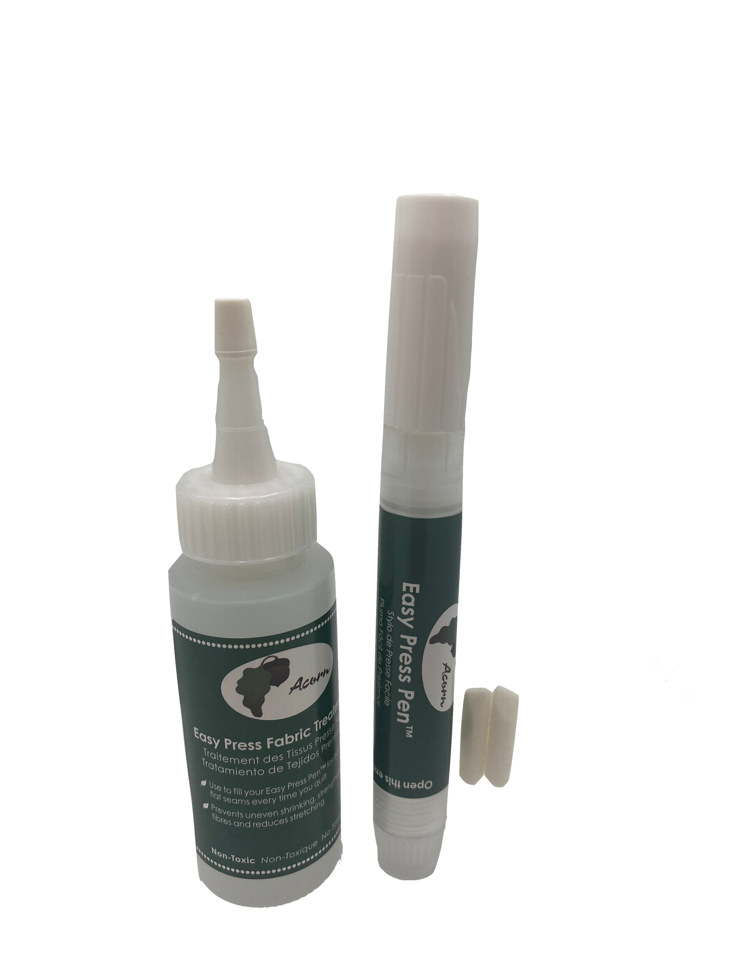 Unscrew the bottom end of the Easy Press Pen™. Fill it with Easy Press Fabric Treatment™. Screw lid back on pen and recap the Easy Press Fabric Treatment™ Bottle.
